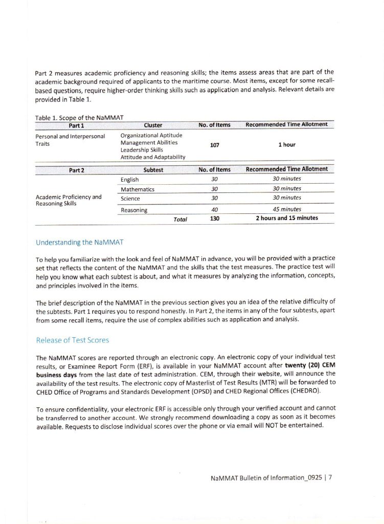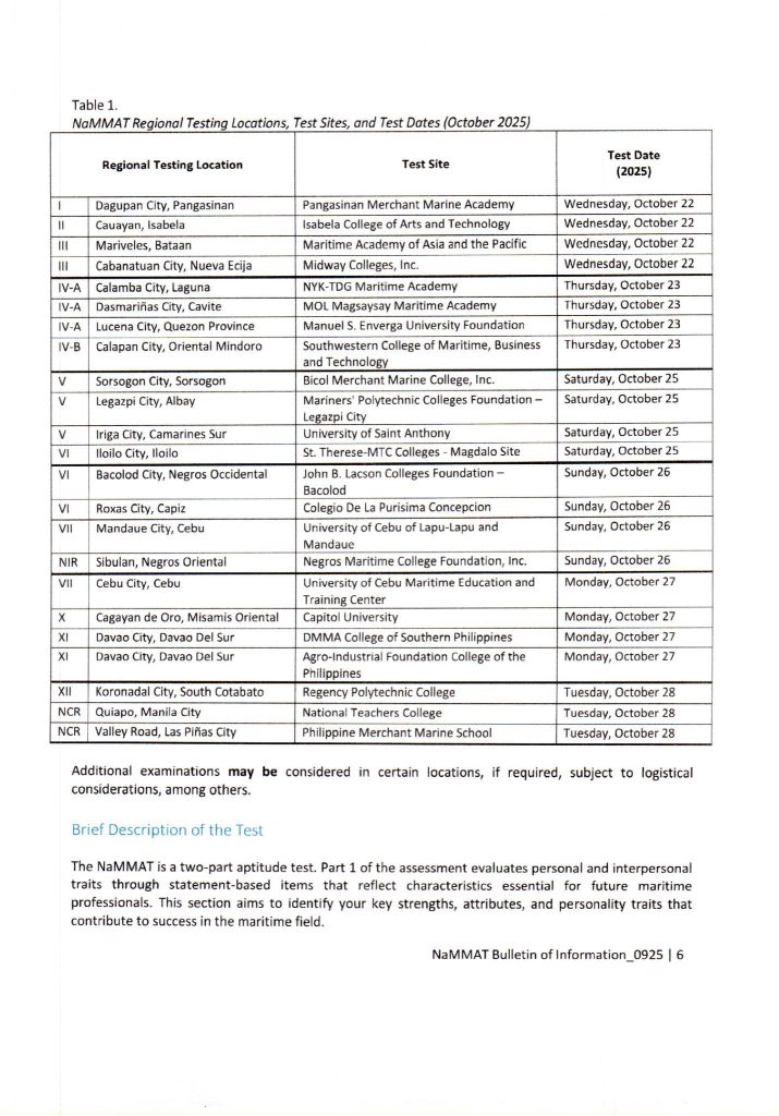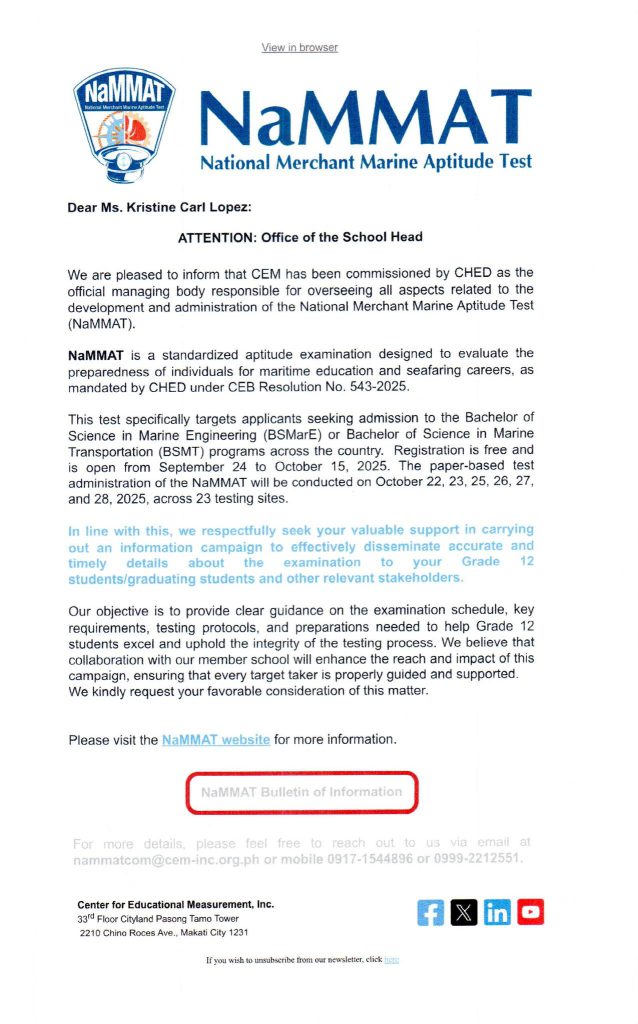 To all interested students who wish to enroll in the COLLEGE OF MARITIME EDUCATION, please be informed that the National Merchant Marine Aptitude Test (NaMMAT) will be conducted this coming October 2025.